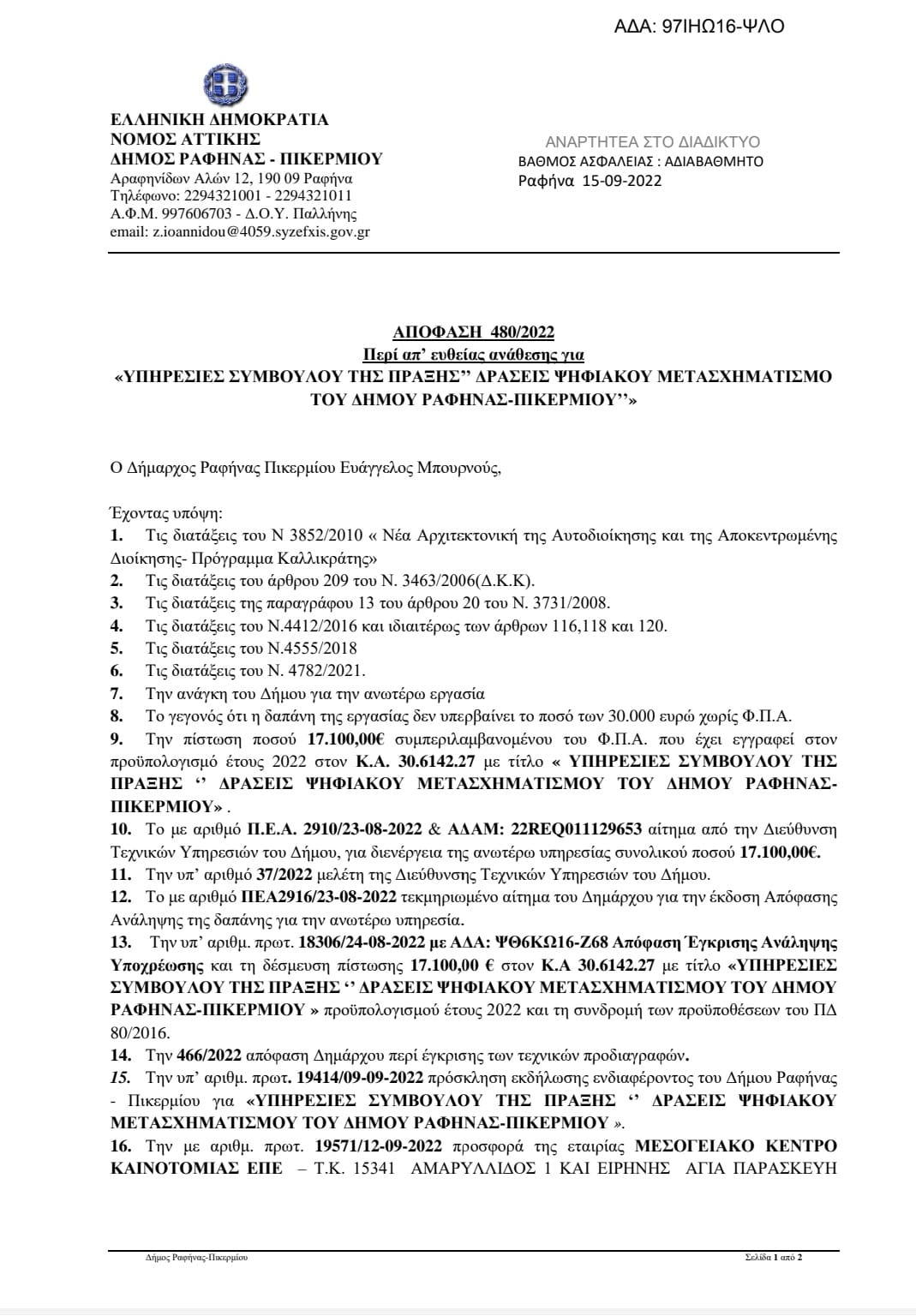 από το Υπουργείο Ψηφιακής Διακυβέρνησης ως δικαιούχος 570.000€ απο το πρόγραμμα ” ΨΗΦΙΑΚΟΣ ΜΕΤΑΣΧΗΜΑΤΙΣΜΟΣ ΔΗΜΩΝ”.