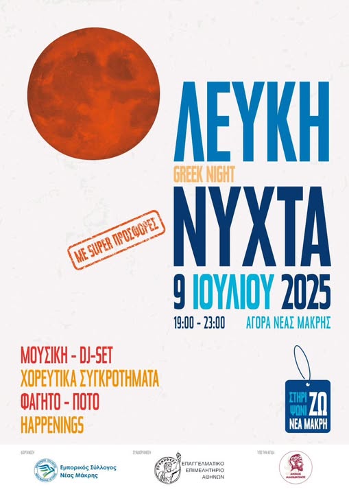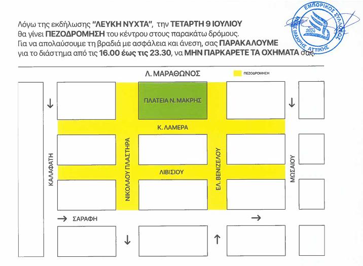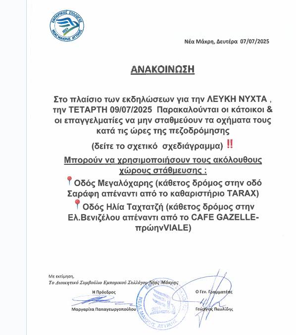 ΕΜΠΟΡΙΚΟΣ ΣΥΛΛΟΓΟΣ ΝΕΑΣ ΜΑΚΡΗΣ – ΑΝΑΚΟΙΝΩΣΗ ΣΕ ΠΟΛΙΤΕΣ ΚΑΙ ΚΑΤΟΙΚΟΥΣ ΓΙΑ ΠΕΖΟΔΡΟΜΗΣΗ ΕΚΔΗΛΩΣΗΣ ΛΕΥΚΗΣ ΝΥΧΤΑΣ