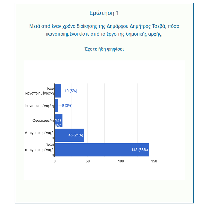 Η δυσαρέσκεια απέναντι στη δημοτική αρχή είναι καθολική. Στην ερώτηση «Πόσο ικανοποιημένοι είστε από τη διοίκηση της Δημάρχου Δημήτρας Τσεβά;», τα αποτελέσματα ήταν συντριπτικά: