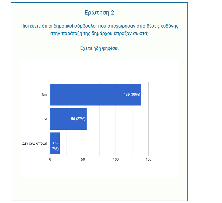 Η αποχώρηση των συμβούλων από τις θέσεις ευθύνης στην παράταξη της Δημάρχου χαρακτηρίζεται ως σωστή από το 66% των πολιτών, ενώ μόλις το 27% τη θεωρεί λανθασμένη.