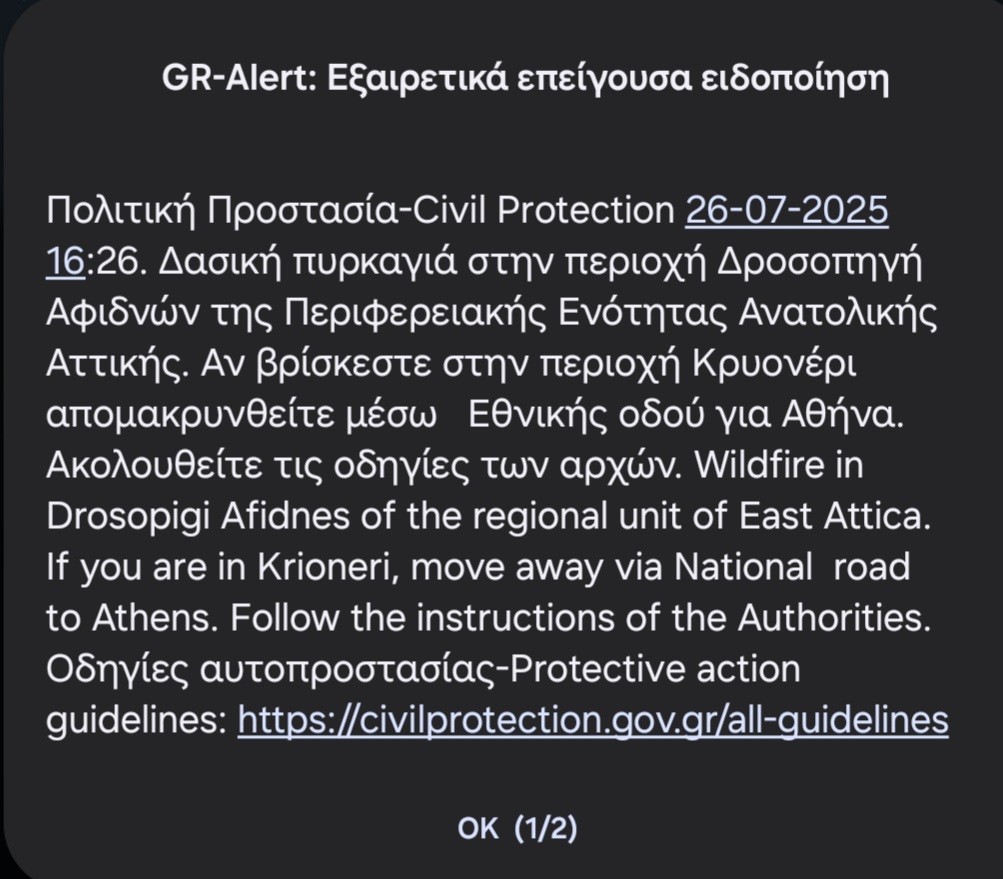 Εξαιρετικά επείγουσα ειδοποίηση εστάλη από την Πολιτική Προστασία στους κατοίκους της Ανατολικής Αττικής λόγω μεγάλης δασικής πυρκαγιάς στην περιοχή Δροσοπηγή Αφιδνών.