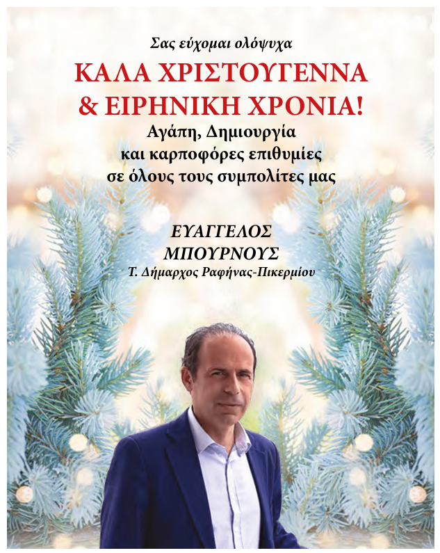 Ευχές με μήνυμα αγάπης, δημιουργικότητας και κοινωνικής ηρεμίας απευθύνει προς τους συμπολίτες του ο πρώην Δήμαρχος Ραφήνας-Πικερμίου, Ευάγγελος Μπουρνούς, με αφορμή τις γιορτές των Χριστουγέννων και την έλευση του νέου έτους. Στο μήνυμά του αναδεικνύει την αξία της ειρηνικής συνύπαρξης και της συλλογικής προόδου, εκφράζοντας την ευχή η νέα χρονιά να συνοδευτεί από καρποφόρες προσπάθειες και θετικές εξελίξεις για την τοπική κοινωνία.