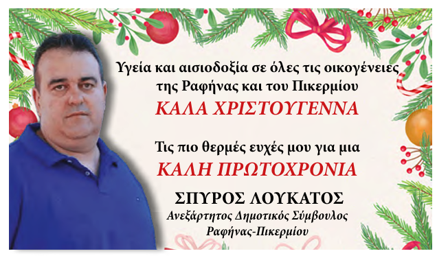 Τις θερμές του ευχές προς τις οικογένειες της Ραφήνας και του Πικερμίου απευθύνει ο ανεξάρτητος Δημοτικός Σύμβουλος Ραφήνας-Πικερμίου, Σπύρος Λουκάτος. Στο μήνυμά του δίνει έμφαση στην υγεία και την αισιοδοξία, εκφράζοντας την ευχή το νέο έτος να συνοδευτεί από σταθερότητα, προσωπική πρόοδο και καλύτερες συνθήκες για την καθημερινότητα των συμπολιτών.