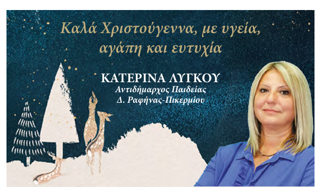 Τις ευχές της για καλά Χριστούγεννα απευθύνει προς τους συμπολίτες της η Αντιδήμαρχος Παιδείας του Δήμου Ραφήνας-Πικερμίου, Κατερίνα Λυγκού. Στο μήνυμά της δίνει έμφαση στην υγεία, την αγάπη και την ευτυχία, υπογραμμίζοντας τη σημασία της ανθρώπινης μέριμνας και της στήριξης της νέας γενιάς, με την ευχή η νέα χρονιά να φέρει ηρεμία και θετικές προοπτικές για όλους.