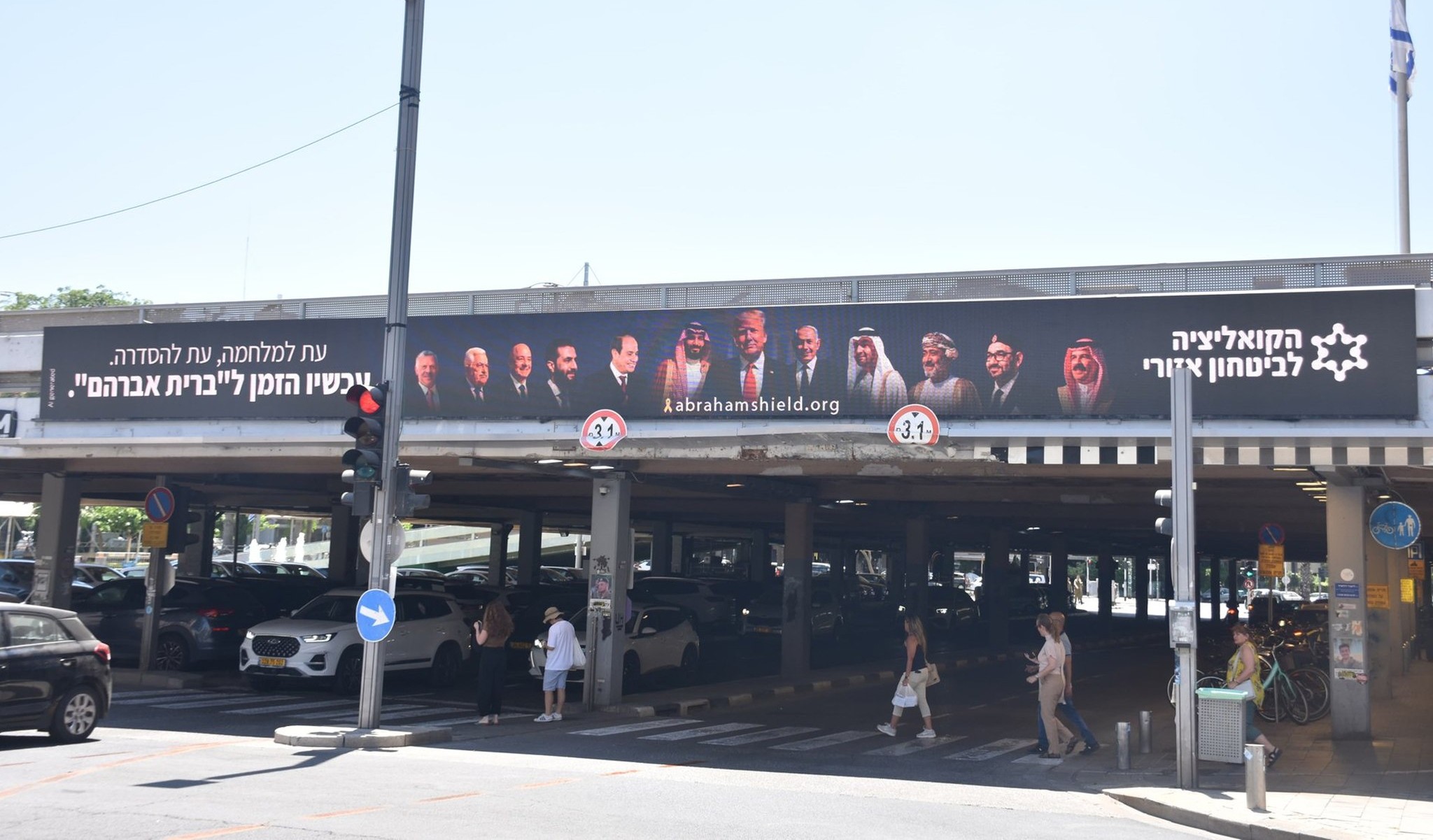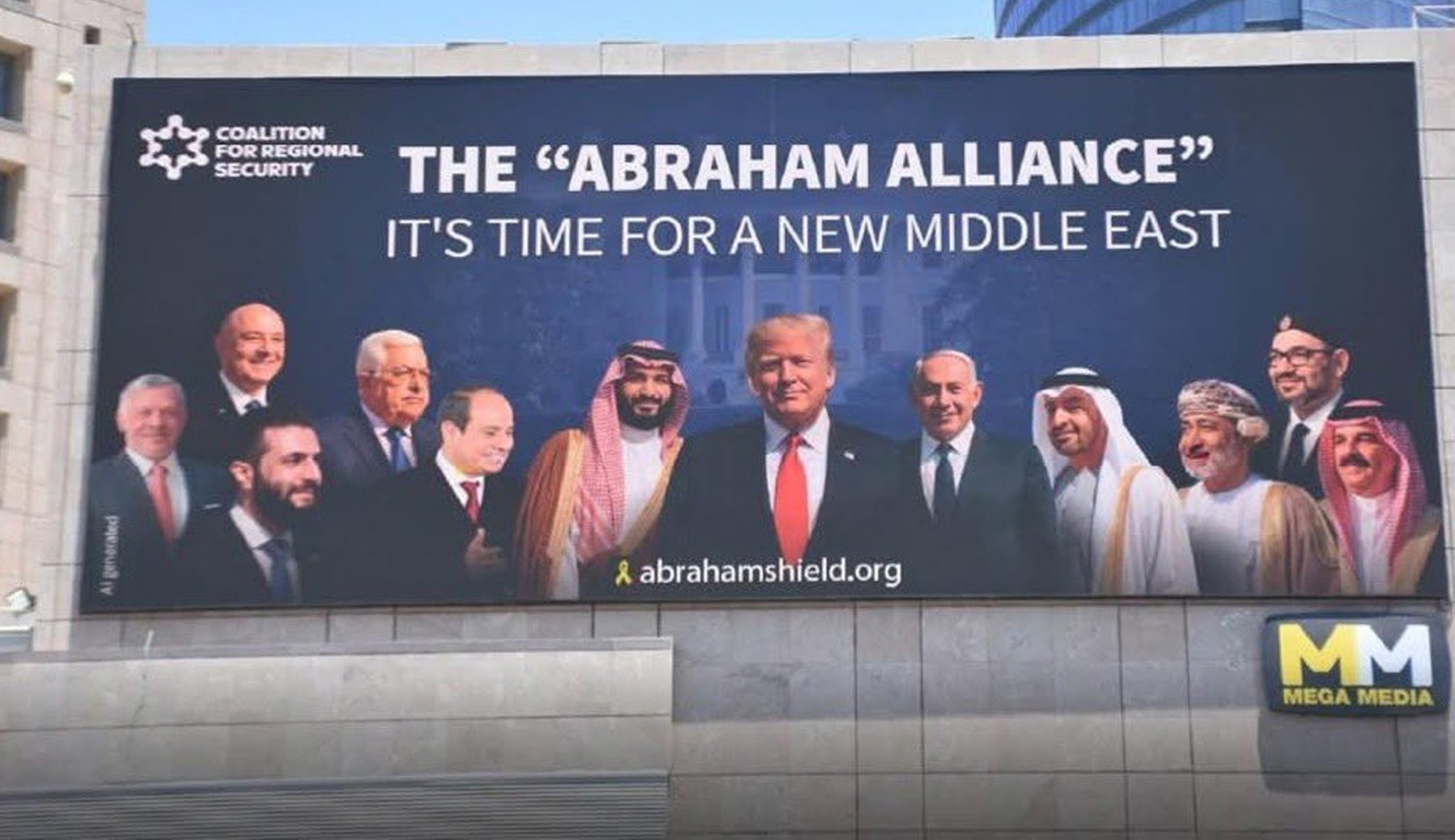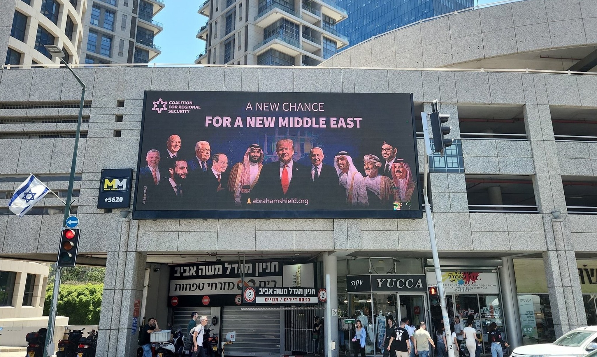 Τελ Αβίβ – Μία εντυπωσιακή γιγαντοαφίσα με τον τίτλο «The Abraham Alliance» (Η Συμμαχία του Αβραάμ) κοσμεί πλέον το κέντρο του Τελ Αβίβ, προκαλώντας συζητήσεις και έντονες αντιδράσεις. Πάνω στην αφίσα, εικονίζονται αγκαζέ δεκατρείς ηγέτες της Μέσης Ανατολής —μεταξύ αυτών Άραβες, Εβραίοι και Δυτικοί— πλάι στον πρώην πρόεδρο των ΗΠΑ, Ντόναλντ Τραμπ. Ο ίδιος, άλλωστε, αποτέλεσε την κινητήριο δύναμη της πρωτοβουλίας των Συμφωνιών του Αβραάμ το 2020.