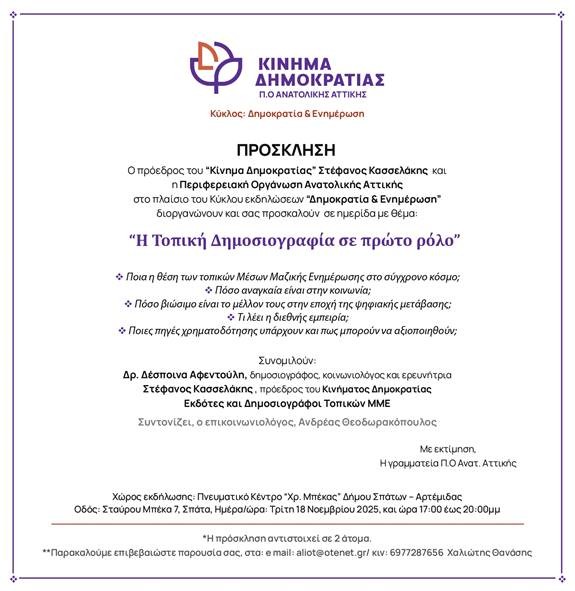 Στο πλαίσιο αυτό, η Περιφερειακή Οργάνωση Ανατολικής Αττικής του Κινήματος Δημοκρατίας διοργανώνει ημερίδα με τίτλο «Η Τοπική Δημοσιογραφία σε πρώτο ρόλο», στον κύκλο εκδηλώσεων «Δημοκρατία & Ενημέρωση», την Τρίτη 18 Νοεμβρίου 2025 στο Πνευματικό Κέντρο «Χρ. Μπέκας» στα Σπάτα.