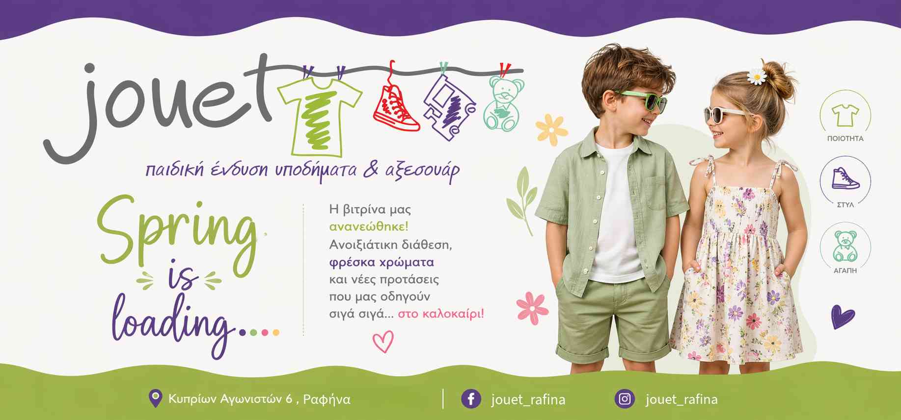 Η βιτρίνα δεν είναι απλώς μια παρουσίαση προϊόντων. Είναι μια μικρή ιστορία που αποτυπώνει την καθημερινότητα του παιδιού, τις βόλτες, το παιχνίδι και τις πρώτες ανοιξιάτικες εξορμήσεις. Με έμφαση στη λεπτομέρεια και την ποιότητα, το Jouet συνεχίζει να προσφέρει ολοκληρωμένες προτάσεις για παιδιά έως 16 ετών, καλύπτοντας κάθε ανάγκη σε ρούχα, παπούτσια και αξεσουάρ.