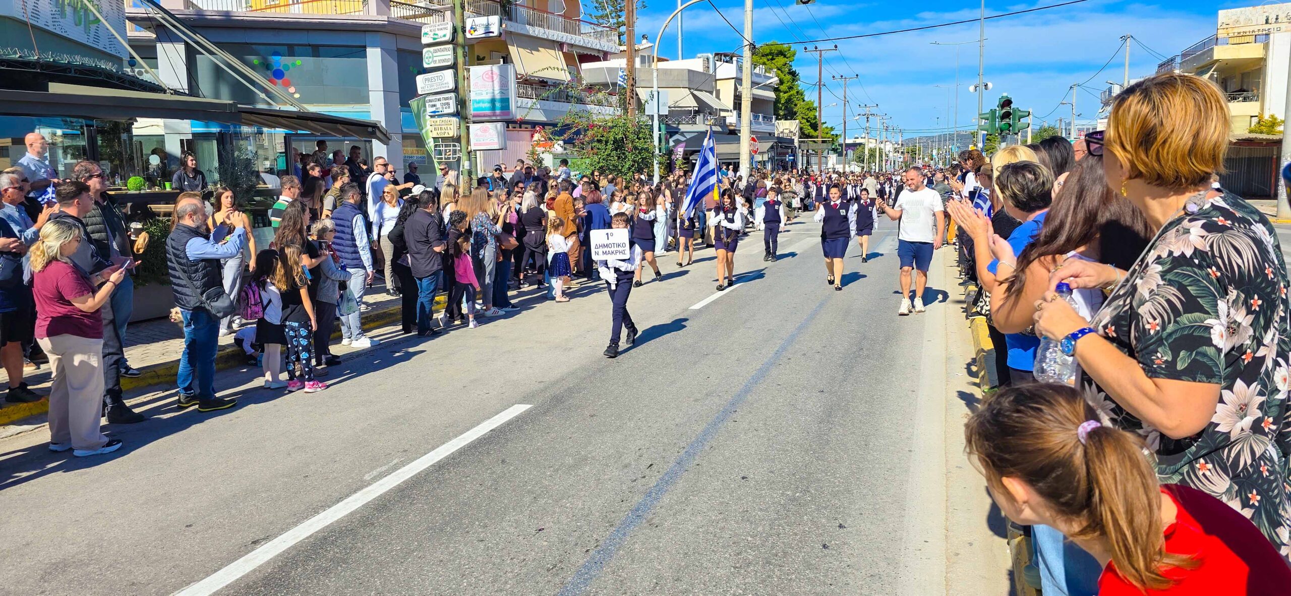 Σε μια ηλιόλουστη και εορταστική ημέρα, πραγματοποιήθηκε σήμερα στη Νέα Μάκρη η μαθητική παρέλαση για την εθνική επέτειο της 28ης Οκτωβρίου, κατά μήκος της κεντρικής λεωφόρου της πόλης.
