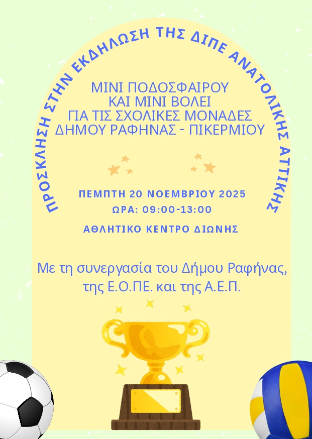 Παιδαγωγική αθλητική δράση με τη συμμετοχή μαθητών και μαθητριών από τα έξι δημοτικά σχολεία του Δήμου μας πραγματοποιήθηκε στο ανακαινισμένο Αθλητικό Κέντρο της Διώνης. Οι μαθητές συμμετείχαν σε παιχνίδια ποδοσφαίρου και βόλεϊ, στο πλαίσιο προγράμματος της Πρωτοβάθμιας Εκπαίδευσης Ανατολικής Αττικής.