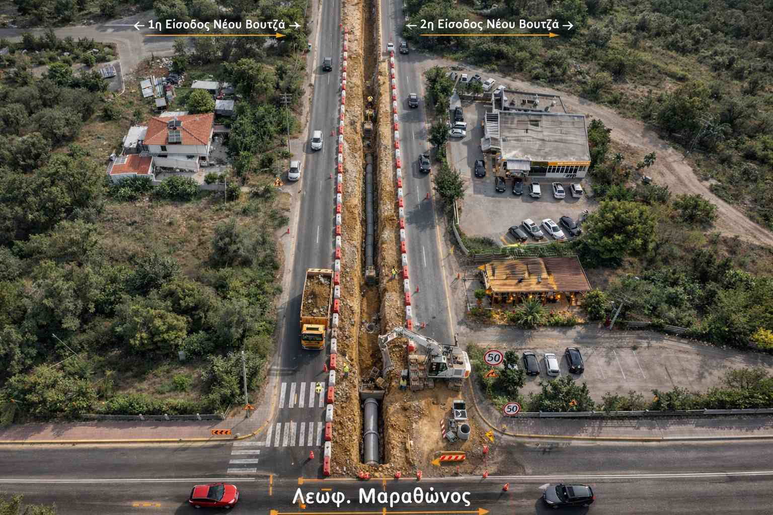 Με την ολοκλήρωση του πρώτου σκέλους, ξεκινά πλέον το δεύτερο τμήμα του αποχετευτικού έργου επί της Λεωφόρος Μαραθώνος, στα όρια μεταξύ του Δήμος Μαραθώνος και του Δήμος Ραφήνας-Πικερμίου.