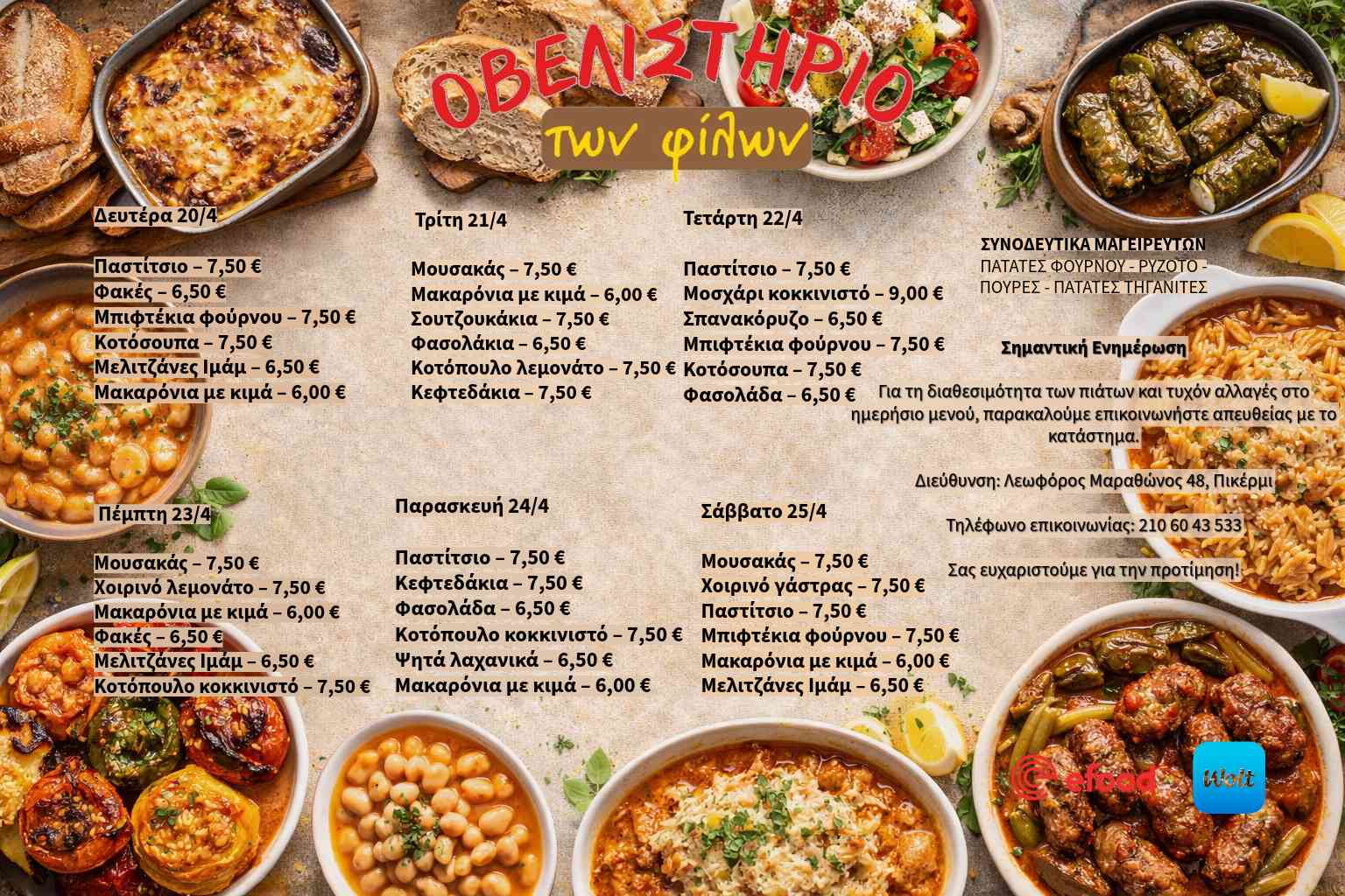 Σε μια εποχή που ο χρόνος είναι περιορισμένος αλλά η ανάγκη για ποιοτικό φαγητό παραμένει, το Οβελιστήριο των Φίλων δίνει καθημερινά τη λύση με μια πλούσια ποικιλία από μαγειρευτά πιάτα που θυμίζουν… σπίτι. Κάθε εβδομάδα, η κουζίνα ετοιμάζει φρέσκες συνταγές με προσεγμένα υλικά και αυθεντικές γεύσεις, κρατώντας ζωντανή την παράδοση της ελληνικής μαγειρικής.