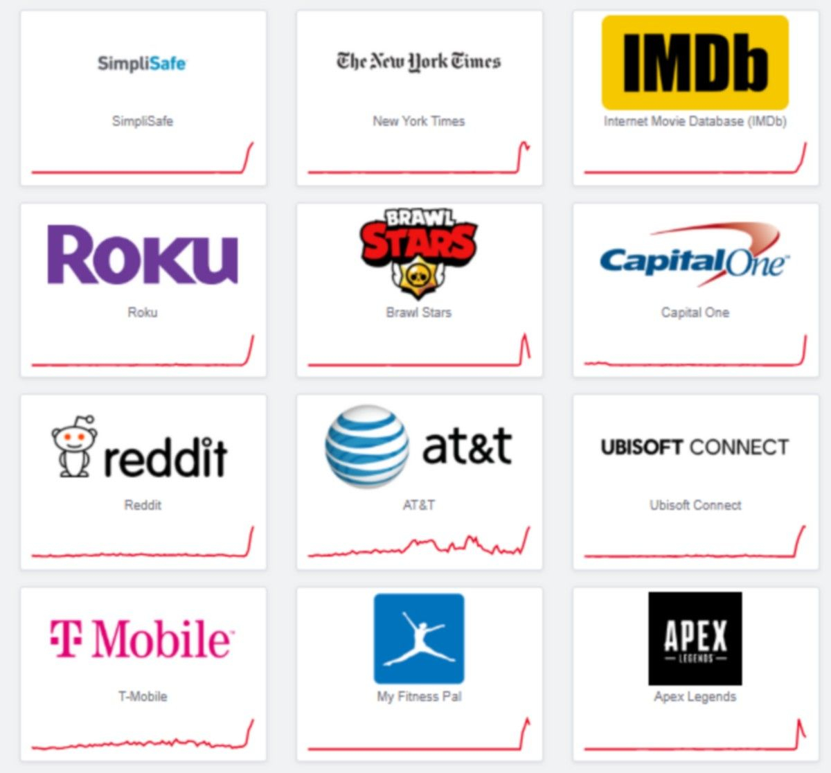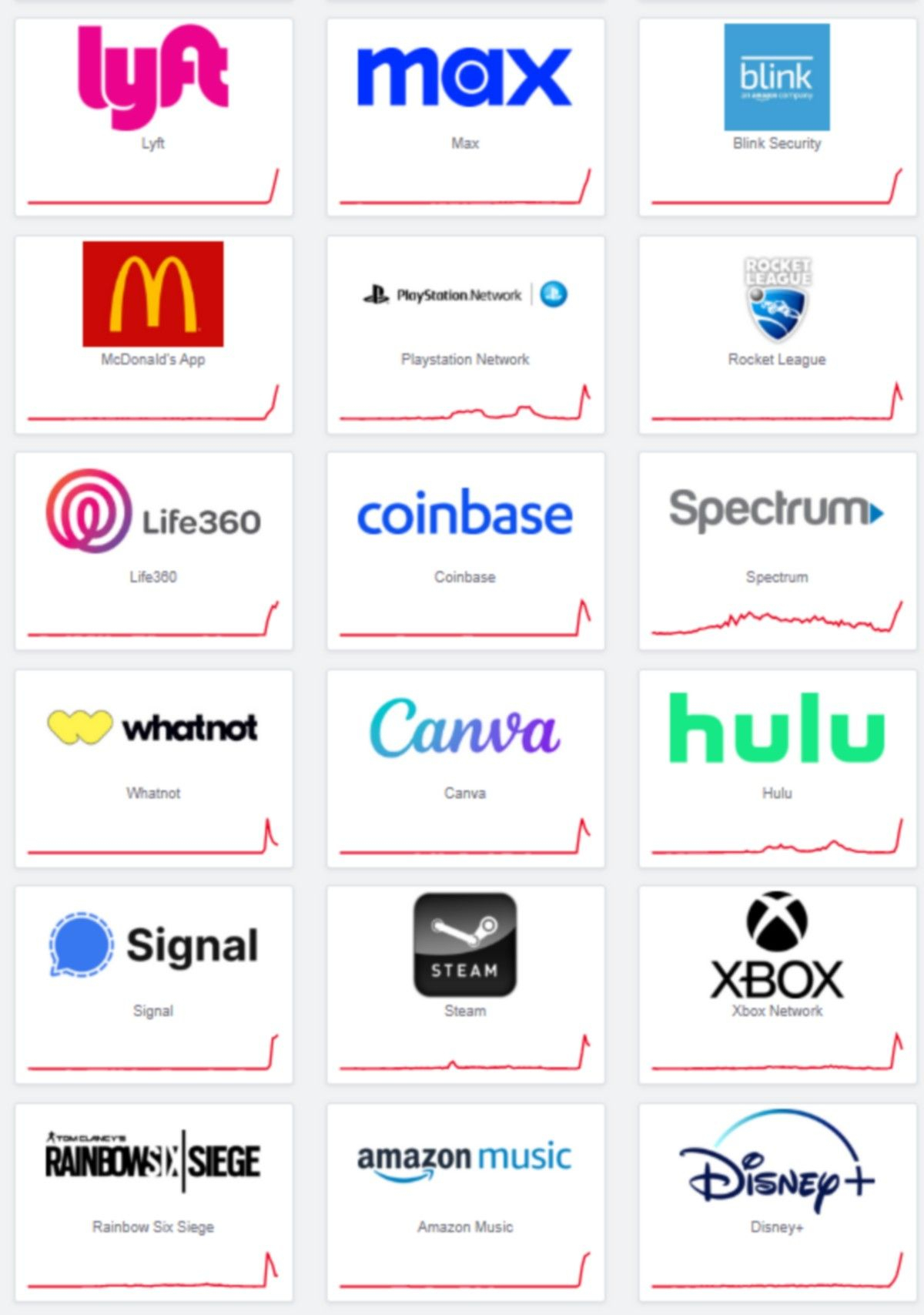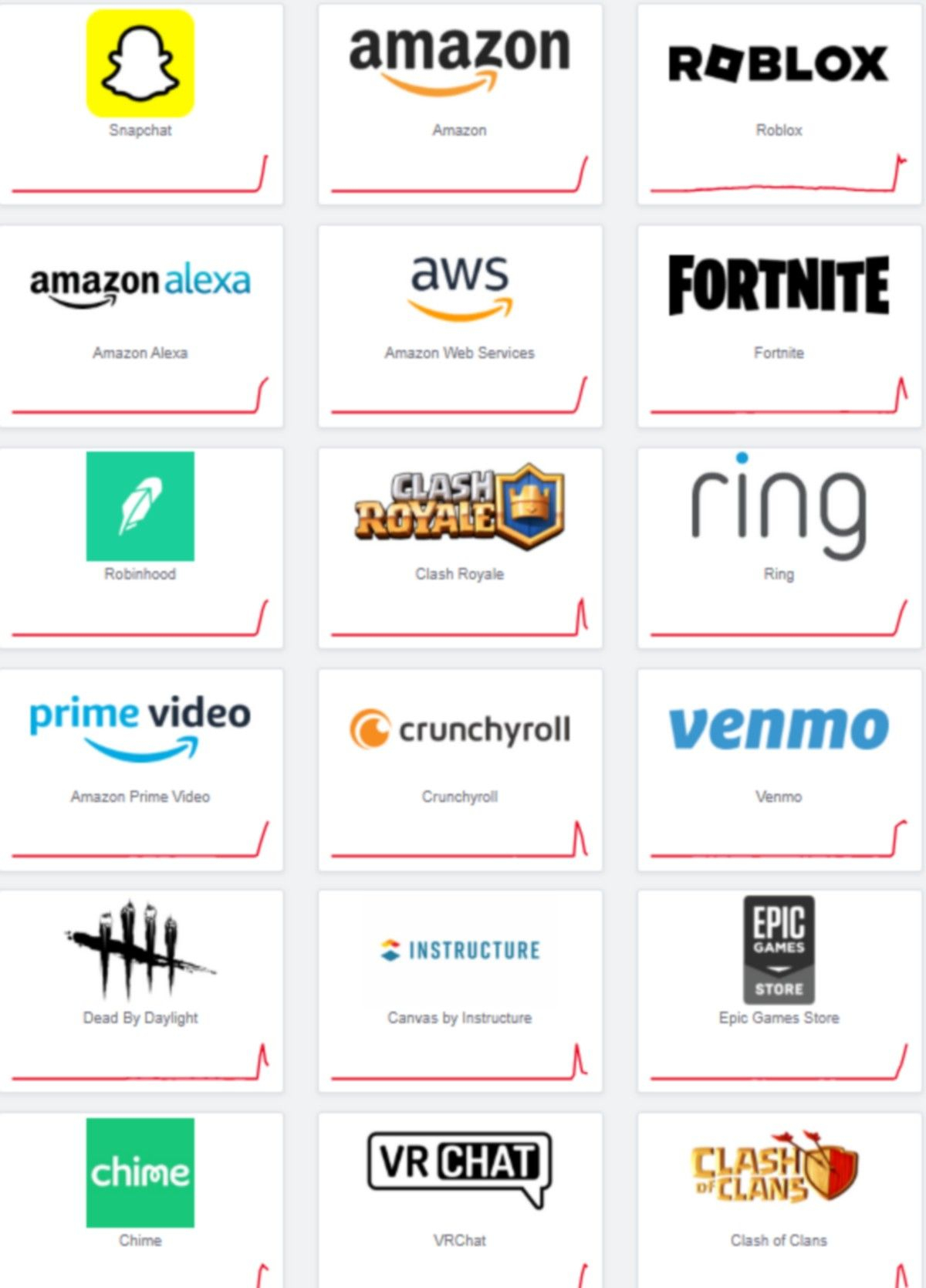 Snapchat, Ring, Roblox, Clash Royale, Life360, My Fitness Pal, Xero, Canva, Amazon, Amazon Web Services, Amazon Music, Prime Video, Clash of Clans, Fortnite, Wordle, Duolingo, Coinbase, HMRC, Vodafone, Playstation, Pokémon Go.