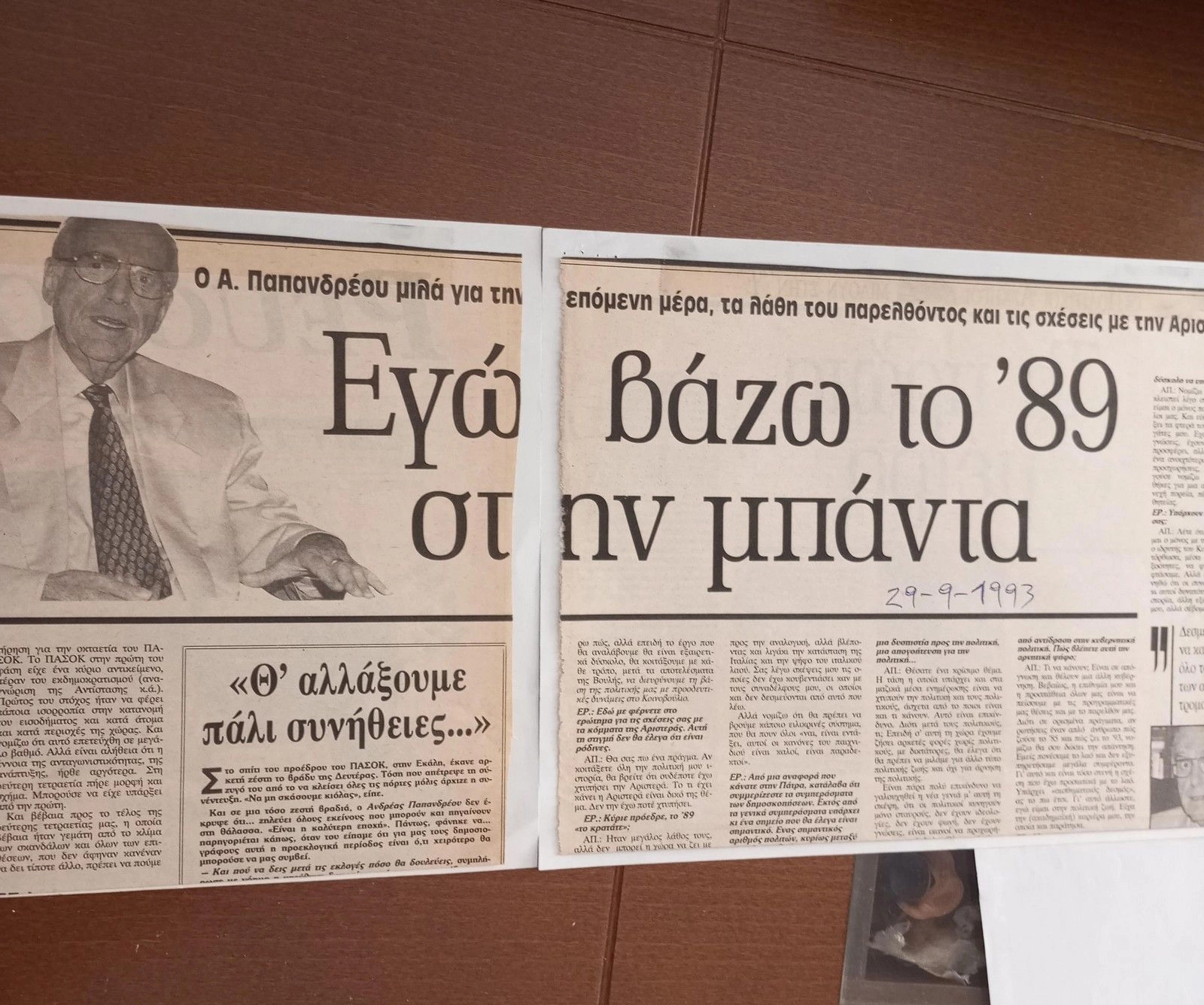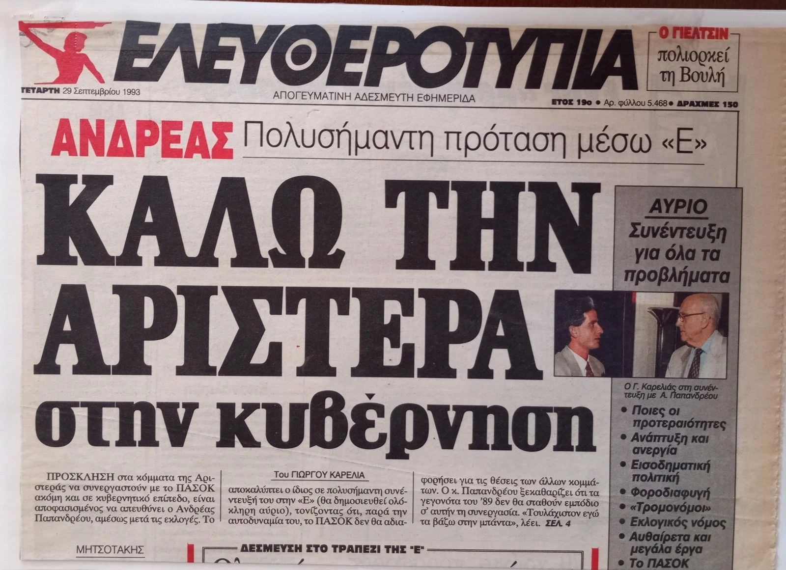 ΥΓ: Χρήσιμη υπενθύμιση- λόγω της σημερινής επετείου της 18ης Οκτωβρίου 1981- για το πώς οι μεγάλοι ηγέτες παραμερίζουν το παρελθόν χάριν του παρόντος και του μέλλοντος. Όλοι γνωρίζουμε τις άγριες συνθήκες της πολιτικής μας ζωής την περίοδο του 1989, τότε που είχαμε την πρώτη «παρά φύσιν» συνεργασία Δεξιάς και Αριστεράς, με στόχο το ΠΑΣΟΚ και προσωπικά τον Ανδρέα Παπανδρέου. Η φάση πέρασε, η συνεργασία κατέρρευσε και το ΠΑΣΟΚ επανήλθε πανίσχυρο. Λίγο πριν από τις εκλογές της 10ης Οκτωβρίου 1993 πήρα την τελευταία προεκλογική συνέντευξη του Ανδρέα για την τότε ΕΛΕΥΘΕΡΟΤΥΠΙΑ. Και όταν άκουσα την απάντησή του στην ερώτηση για το 1989 και τις σχέσεις του με την Αριστερά, οι οποίες ήταν ακόμη τεταμένες, κόντεψα να…πέσω από την καρέκλα μου. Η απάντηση συνοψίζεται στους δύο τίτλους που βάλαμε στη συνέντευξη και τους βλέπετε παρακάτω. Τα συμπεράσματα αυτονόητα για τη σημερινή μυωπική πολιτική του κόμματός του…