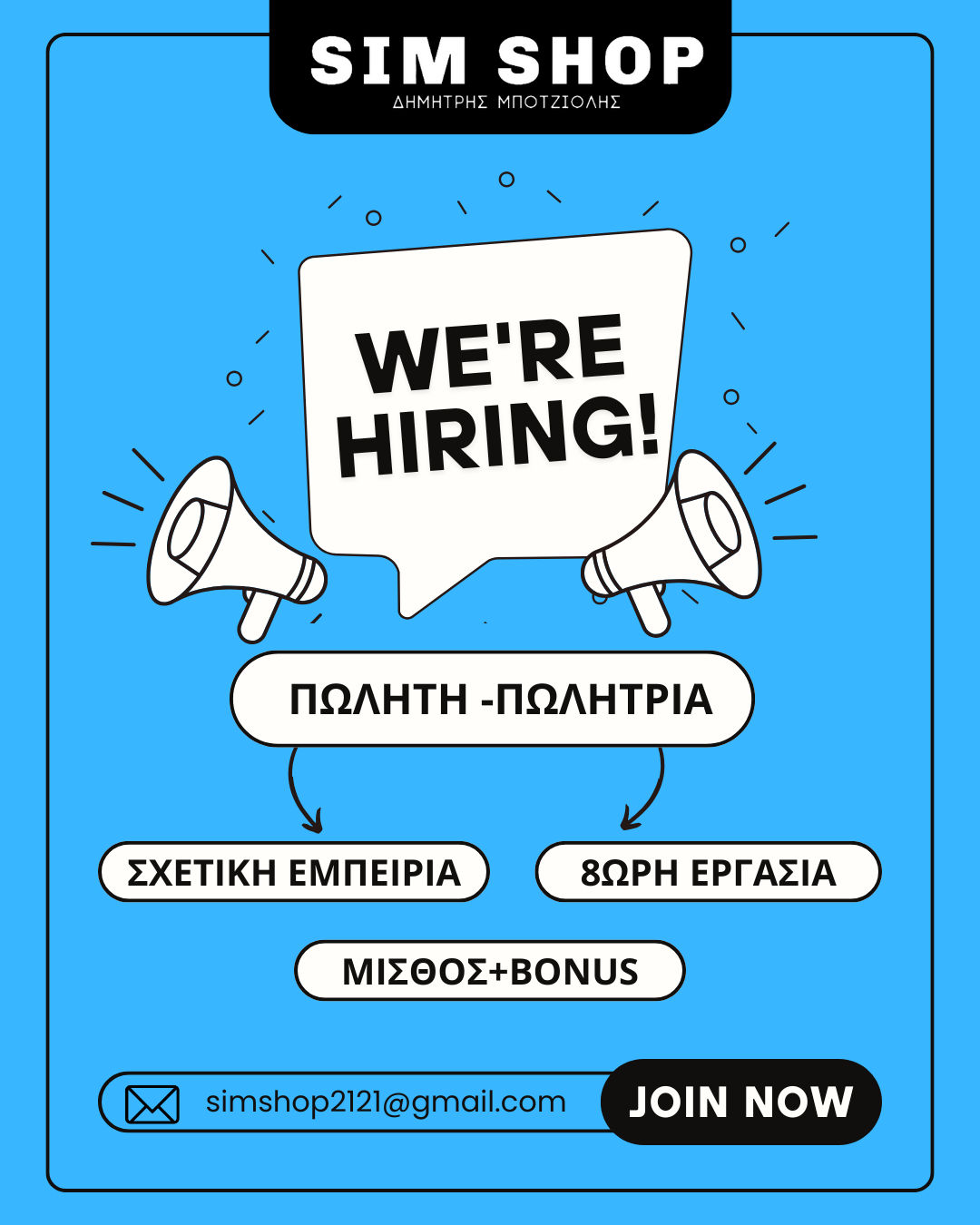 Το SIM SHOP Αρτέμιδα, κατάστημα ηλεκτρονικών ειδών και υπηρεσιών τεχνολογίας, αναζητά Πωλητή – Πωλήτρια για μόνιμη απασχόληση.