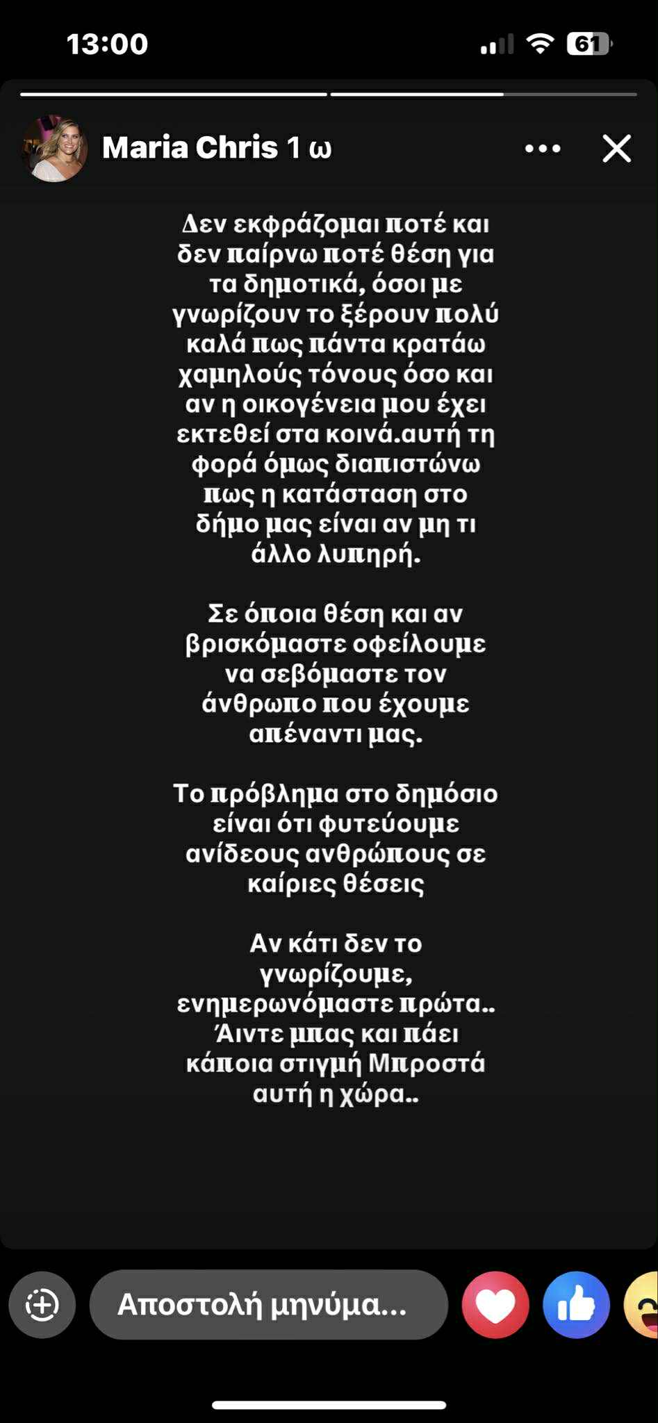 Το περιεχόμενο της δημοσίευσης είναι ιδιαίτερο και αφήνει πολλά ερωτηματικά. Φυσικά, δεν γνωρίζουμε ούτε σε ποιον απευθύνεται, ούτε με ποια αφορμή γράφτηκε. Ωστόσο, από τη διατύπωση των λεγομένων, πολλοί θεωρούν πως «φωτογραφίζει» τον Δήμο Ραφήνας-Πικερμίου. Εκεί άλλωστε ζει, δραστηριοποιείται επαγγελματικά και διατηρεί την επιχείρησή της.